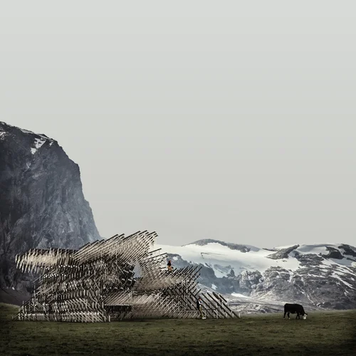 It is built from 475 large bamboo poles that are bent onsite to shape the structure and that are hand-tied together with metal wire using techniques based on Cantonese bamboo scaffolding craftsmanship. The shape is a large diagrid shell structure that is folded down into three hollow columns. These columns rest on three circular concrete footings. A tailor-made white tensile fabric is stretched over the structure and is brightly lit from inside the three legs.
